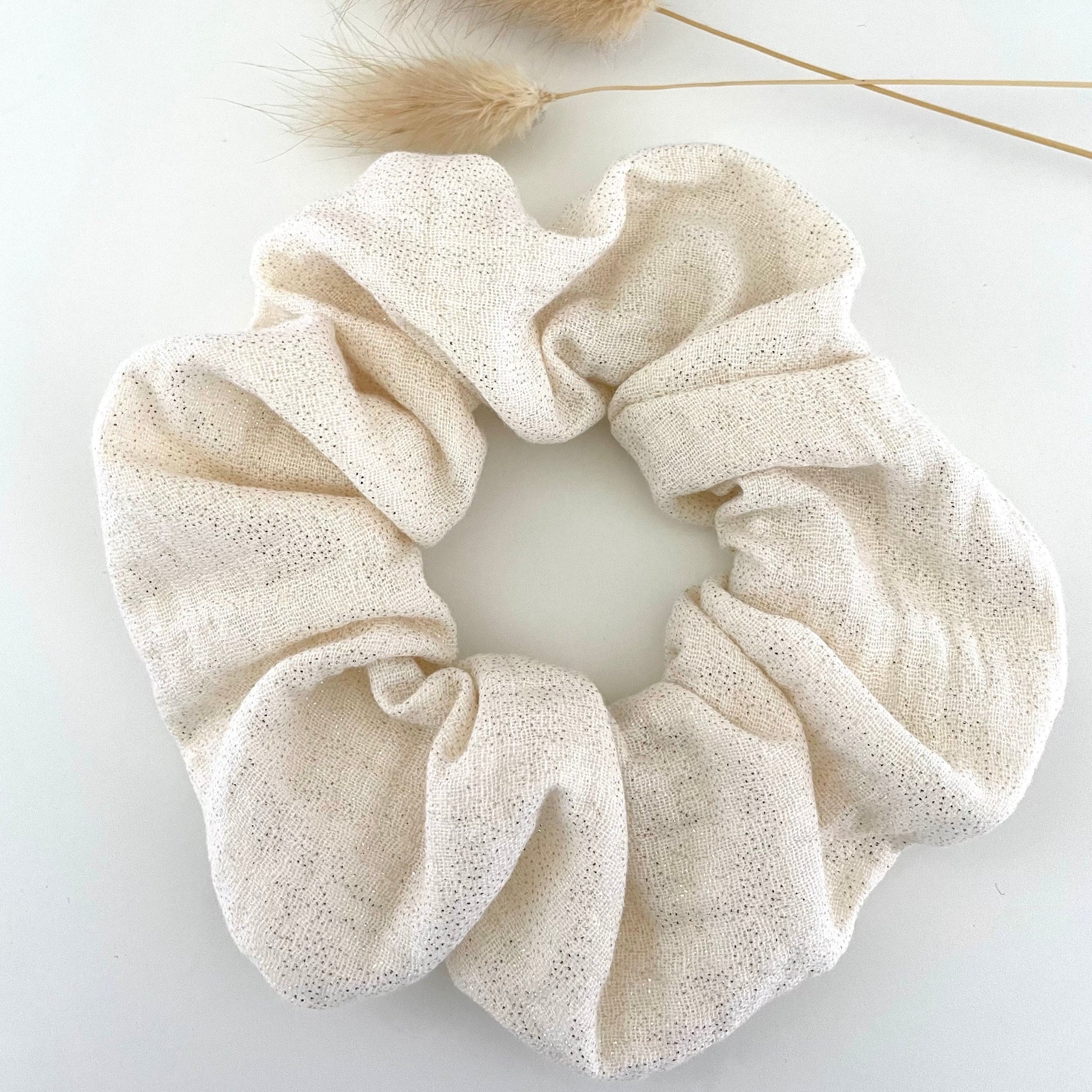 Ce chouchou est fait en double gaze de coton crème subtilement pailleté. Sa texture légère et aérienne, associée à ses reflets délicats, apporte une touche d'élégance à vos coiffures, que ce soir pour un look bohème ou une touche chic au quotidien.