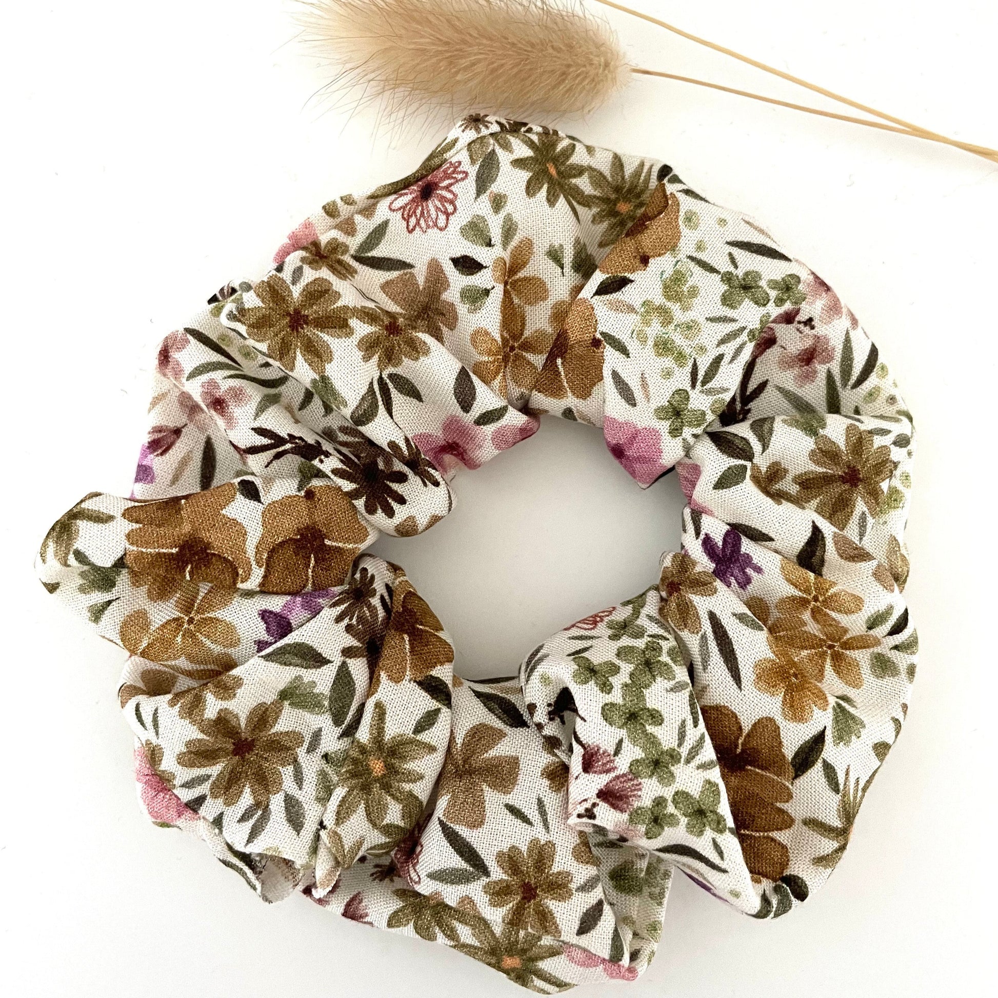 Apportez une touche nature et élégante à vos coiffures avec ce chouchou en viscose fluide, orné de fleurs dans les tons chauds de brun, vert, rose et ocre. Un accessoire doux et confortable, idéal pour rehausser vos tenues avec charme. Fait main avec soin dans notre atelier, série limitée.